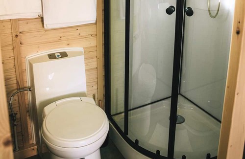 A cozy 221-square-foot retreat designed for comfort and convenience, featuring easy access to water, split-air conditioning, a kitchenette, cooking equipment, and excellent bathroom facilities. These amenities include an eco-friendly cassette toilet with a removable waste-holding tank, hand basin, and shower (electric-heated for hot showers).