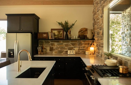 DESIGN – Textured stone contrasts with dark moody hues, creating a space that feels cozy, soothing, and deeply familiar. Inside you will find a mix of refined furniture and elegant finishes, paired with hand selected antiques for a nostalgic cabin feel. Everything has been curated with your experience in mind and was selected from deep intentionality.