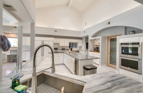 The expansive kitchen boasts marble countertops, a dedicated coffee bar, a sprawling island with a wine fridge, a Sub Zero refrigerator, and double ovens perfect for both casual meals and grand gatherings.