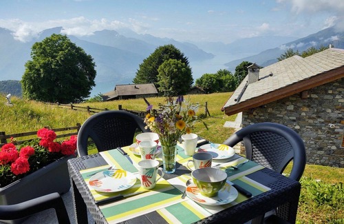 Discover the beauty of "rustico" cottage "Il Nido d'Aquila", a charming vacation rental nestled at an elevation of 1'150 meters above sea level. This cozy dwelling, built in 2013, is surrounded by picturesque meadows, offering a serene escape from the hustle and bustle of everyday life. Situated in the hamlet of Bodone, just 12 km from the center of Gravedona, this property boasts a private fenced garden spanning 500 square meters, complete with a terraced lawn, providing ample space for outdoor relaxation. With amenities such as a yard, internet WiFi, and parking, you'll find all the necessary conveniences for a comfortable stay.