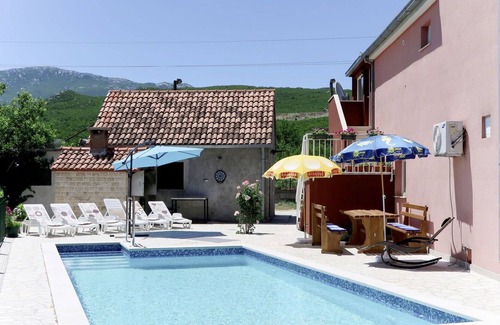 Semi-detached house "Marija (OMI150)". 200 m from the centre of Srijane, 32 km from the centre of Omiš, 39 km from the centre of Split, 32 km from the sea, 400 m from the river. Private: property 600 m2 (fenced) with lawn and wildlife garden, swimming pool (8 x 4 m, depth 150 cm, seasonal availability: 30.May. - 12.Sep.) with internal staircase. Unconventional pool shape. Table tennis, terrace, garden furniture, barbecue (swing), pool maintenance by the owner/gardener. In the house: internet access, washing machine. Parking (for 4 cars) at the house on the premises. Shop 7 km, supermarket 15 km, pebble beach 32 km. Please note: the owner lives in the same residence.