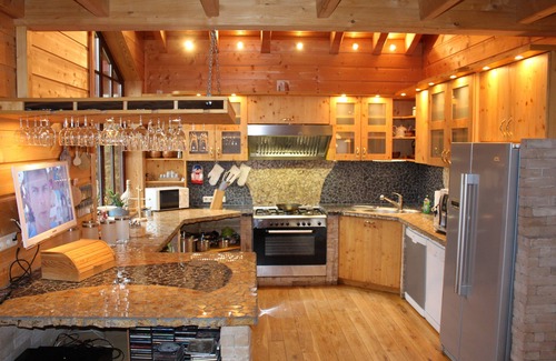 Spacious American-style kitchen - 2 large refrigerators, 2 dishwashers, 5-ring gas stove, built-in bar with glass rack.