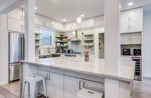 With an open floor plan for gathering and entertaining, you can warm up with the huge gas fireplace in the heart of the home. Open the double sets of French doors to the private deck with large sectional sofa and patio with cushioned dining set. Enjoy open air living while listening to Sonos sound system inside and out. Play some games with friends in the den off the main living space. Lounge by the new heated gunite pool (with removable safety fence- great for kids!) and 8 new lounge chairs, sectional sofa in the professionally landscaped backyard with new sod and beautiful landscape lighting. Kick back with a drink from the kitchenette in the pool house. Let the kids enjoy the private play area with a swing-set and slide. Enjoy a soak in the new hot tub all year round! Got a rainy day? That’s a great excuse to stay in and watch a movie on the big screen in the movie theater. Retreat to your 5 huge hotel-like guest suite bedrooms each with their own spa like bathrooms and all with King beds!
