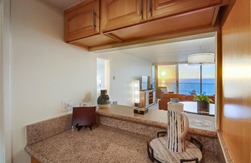 As you enter our sky high condo you'll feel like you're floating on the water. The bright & sunny open floorplan main living area includes an ocean front balcony with panoramic ocean views, floor to ceiling windows, wood floors, dual sofas, SMART TV & designer features throughout. Enjoy dining with a view?... You'll love the adjacent dining area with a separate window looking North towards Law St park & multi-million dollar homes along the La Jolla coastline, a rare treat only for corner units. The kitchen is fully equipped including dishwasher, full kitchenware & views out to the main living area.