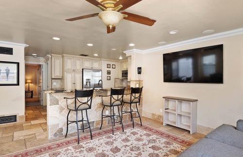 2 bedrooms host 1 king and 1 queen bed. 2 Full bathrooms.