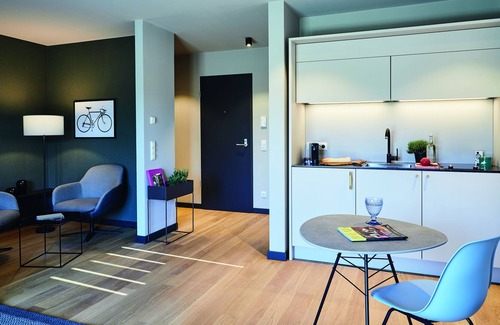 The ipartment Xtra Smart offers all the essential features for a comfortable stay. It has a fully equipped designer kitchen with refrigerator, ceramic hob, microwave and dishwasher, a small desk with a comfortable chair or armchair and a modern bathroom. The floor is laid out with oak parquet. Your bed is 1.40 m wide so you have plenty of room. Fancy a little change of scenery? From mid-2019 you can relax in our lounge on the ground floor.
