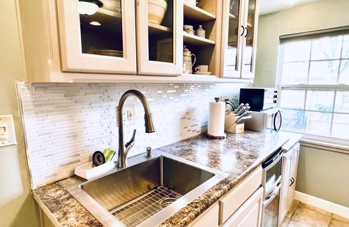 Well equipped kitchen w/ new stove range, refrigerator, microwave, toaster oven ,keurig coffee maker, wine cooler, Jacuzzi bathtub, smart tv, Netflix, Disney Plus, Hulu and free Wi-Fi.