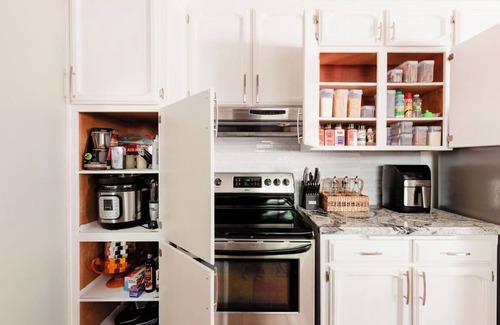 A fully stocked kitchen with everything you need to cook, bake, and enjoy your favorite beverages.