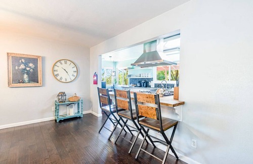 Inside, you'll find a space just as relaxing. There are 2 separate living spaces, plus another dining/living room that offers lots of room to spread out. Entertainment options include board games, a piano in the dining area, a two-in-one Pool table and Ping-Pong table, and two-streaming capable TVs. A field guide in the home makes for a fun scavenger hunt for kids to wander the property and identify local flora and fauna. A dedicated workspace in the primary bedroom assists with any remote work. The six-burner stove in the full, well-equipped kitchen is ideal for feeding a crowd, and there's room for everyone at the adjacent dining table. There are split air-conditioning units in the downstairs rooms and central air-conditioning upstairs to keep everyone cool when the weather is warm.