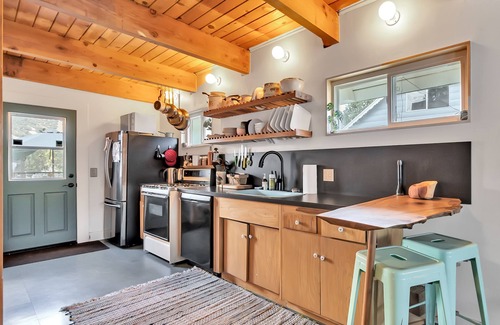 The kitchen is fully stocked ready for culinary memory making! The bathroom is brand new with a beautiful dual-sink wood vanity and large soaking tub...epsom salt awaits! Both bedrooms upstairs have vaulted A Frame wood ceilings with built in closets & storage. The first bedroom has a cozy large King bed & wall-mounted TV. The other bedroom has a Queen bed and writing desk with mountain views. You'll find all the comforts of home while enjoying the quiet, clean mountain air!
