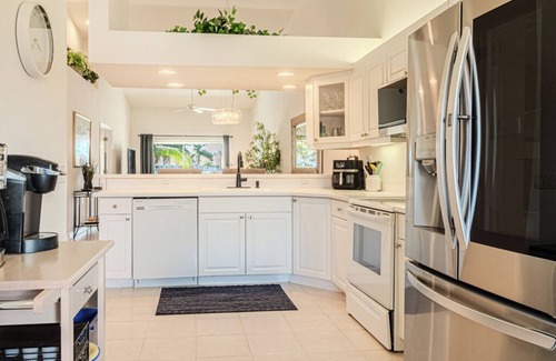 You will enjoy your large bright kitchen white cabinetry, kitchen bar, refrigerator with ice, and filtered water dispenser. The kitchen is well-equipped for all your cooking and baking needs. An adjoining morning room provides a great space to enjoy your morning coffee. There is a separate dining room and living room with plenty of seating which connects to the large screened-in lanai.