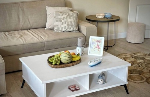The bathroom also includes wellness shower. The whole apartment is flooded with light and is very tastefully decorated. We have placed great emphasis on ecological/health-conscious building materials. Thus, it is finished with pure lime plaster and has eco-vinyl flooring. Please note, the pure lime plaster is softer and therefore more delicate than cement plaster. The kitchen is very well and fully equipped (induction stove, dishwasher, refrigerator with freezer unit, oven, etc.) The large dining table seats 6 people and can be further extended if necessary. The whole apartment also has underfloor heating.