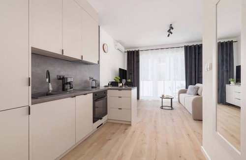 Situated on the 6th floor of a modern apartment complex, the studio is an excellent option for couples or solo travellers who appreciate the combination of elegance, comfort and practicality. The bright, carefully arranged interior has been designed to be conducive to relaxation and create a cosy atmosphere for both short and longer stays. The focal point of the living area is a comfortable double sofa bed, which serves as a place to relax during the day and turns into a comfortable bed in the evening. The interior is complemented by modern accessories and a muted colour scheme, giving the space harmony. The kitchenette is fully equipped with the necessary appliances and accessories, allowing you to prepare both a quick breakfast and a wholesome dinner. Large windows let in plenty of natural light, and the exit to the furnished balcony allows you to enjoy your morning coffee or evening drink with a view of the surroundings. The bathroom, in a sleek, modern design, offers a spacious shower, soft towels and a set of basic toiletries for guests' convenience. High-speed WiFi is available in the flat, allowing you to work comfortably remotely or watch your favourite films and series on the SmartTV. The location in a modern building and functional layout make the studio an ideal base for exploring the city, while providing privacy and tranquillity after a busy day. The flat also comes with a parking space in the underground car park.