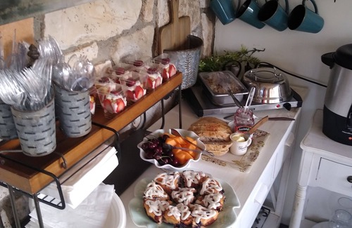 Includes strolling gardens leading to your yard, spacious porch overlooking spectacular scenic views of rolling hills and valley, elec. entry lock, stocked coffee bar, full bathroom with shower, TV w/ DVD library with over 200 movies , and Roku , full breakfast each day served in our breakfast room from 8:00-9:30 am.