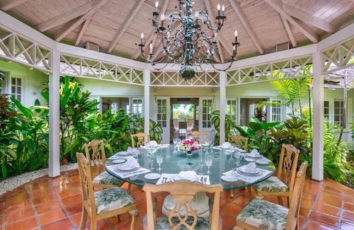 As guests enter this luxury Barbados holiday home, they are met by lush indoor / outdoor gardens. This helps set the scene for this unique home in the tropics. The main bedroom wing at this Sandy Lane luxury villa includes the spacious master bedroom suite and 3 other guest bedroom. All bedrooms have air conditioning and their own private bathrooms and terraces. In addition, the enchanting dining area is bordered by lush tropical plants and a water feature helps set the scene for memorable dinner parties with friends or family.