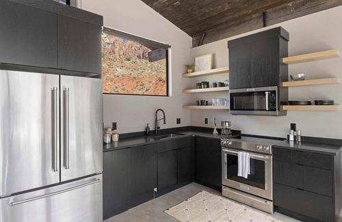 This unique place has a style all its own. The new construction is all about the VIEWS! Vaulted ceilings and panoramic windows offer the best possible views of the canyon from a private space. This modern space has all the conveniences of home with the best possible location, only a 5 minute walk to the national park entrance.