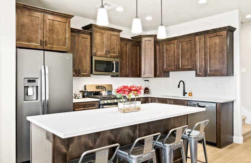 This 4-bedroom designer townhome features open living spaces and access to a pool, hot tub, and lazy river. The gorgeous retreat can comfortably sleep up to 16 guests and seamlessly blurs the lines between indoor and outdoor living. Both kids and adults will have lots to see and do.
