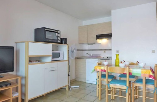 1-room studio 27 m2 on 1st floor. Simple and comfortable furnishings: living room with 1 double sofabed (1 x 140 cm, length 190 cm), TV (flat screen). Exit to the terrace. Sleeping alcove with 1 x 2 bunk beds (90 cm, length 190 cm). Kitchenette (oven, dishwasher, 2 ceramic glass hob hotplates, microwave, freezer, electric coffee machine). Shower, sep. WC. Electric heating. Terrace furniture. Facilities: washing machine, iron, hair dryer. Internet (WiFi, free). Parking space n 109. Please note: maximum 1 pet/ dog allowed. Smoke alarm. Instead of an enclosed bedroom, some sleeping areas are located in an open-plan area (gallery, alcove, etc.). 641250011992F